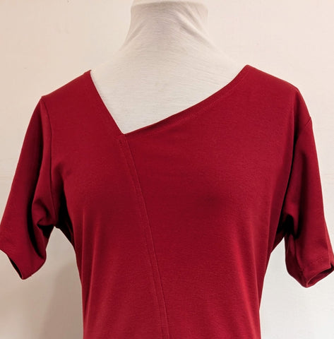 the classic SC little red dress , with asymmetrical seam and neck line .a small centre back slit. it is in a baby rib cotton knit for maximum comfort. available in all sizes or provide us with height, bust, waist,  hip and it will be made based on this information just for you